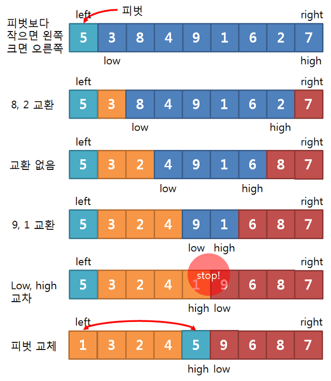 2) low 는 left + 1 자리부터 피벗(5)와 비교하면서 한칸씩 증가한다.
