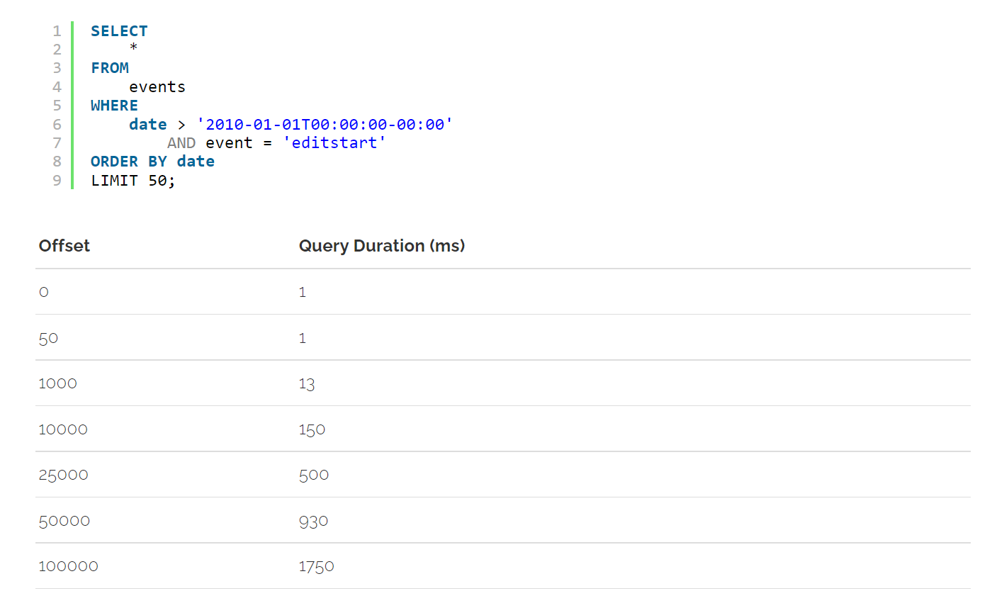많은 케이스에서 낮은 오프셋 쿼리는 느리지 않다. 문제는 높은 오프셋 값으로 시작된다.