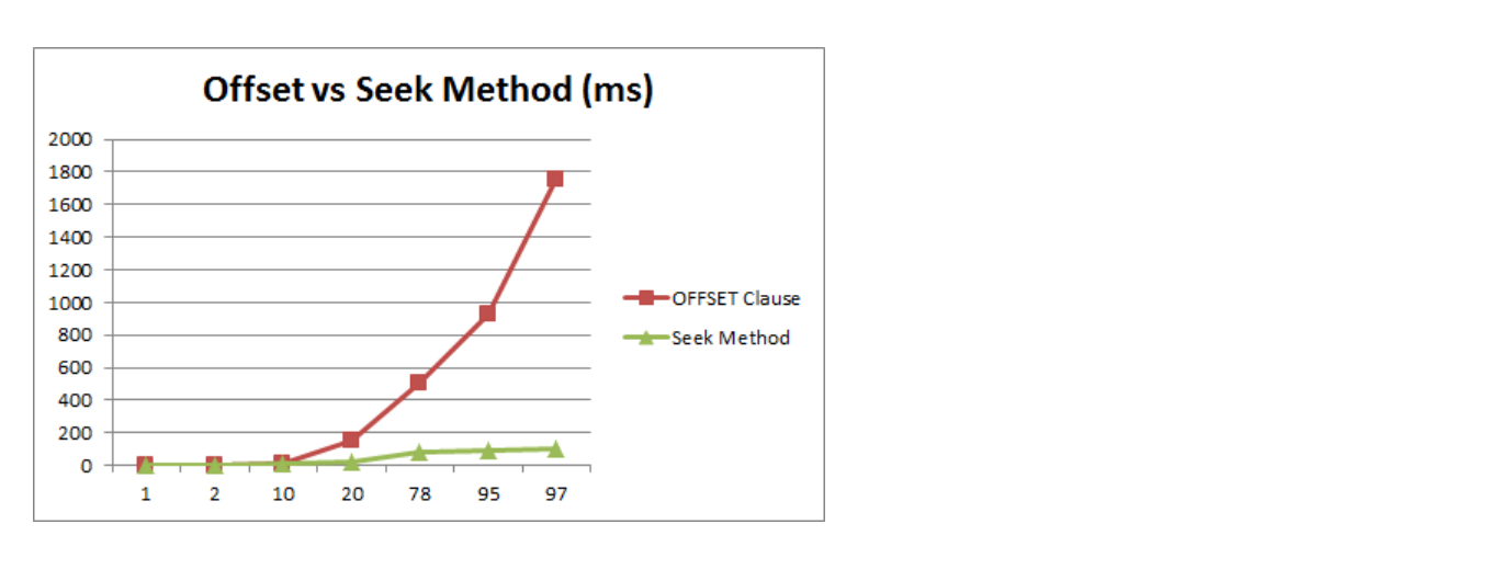 이것은 두가지의 메소드의 성능을 비교했다. 여기서 흥미로운 관측은 Seek Method의 성능이 더 우수할 뿐만 아니라, 테이블에 아무리 멀리 페이지네이트를 하여도 더 안정적이라는 것이다.
