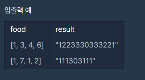 수웅이가 준비한 음식의 양을 칼로리가 적은 순서대로 나타내는 정수 배열 food가 주어졌을 때, 대회를 위한 음식의 배치를 나타내는 문자열을 return 하는 solution 함수를 완성해주세요.