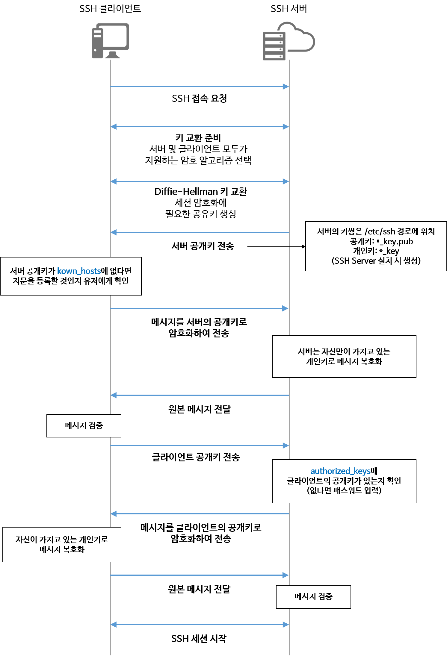 SSH 작동의 핵심은 키(Key)이다. 클라이언트와 서버는 각각의 키를 보유하고 있으며, 이 키를 이용해 연결 상대를 인증하고 안전하게 데이터를 주고 받는다.