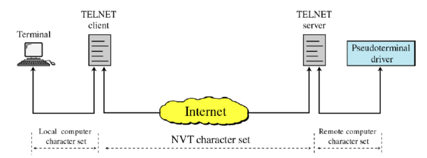 텔넷은 일종의 터미널 에뮬레이션 프로토콜로 NVT(Network Virtual Terminal)라는 가상 터미널의 개념을 사용한다. 이에 텔넷은 터미널과 호스트와의 일대일 대칭적인 관계를 가진다.