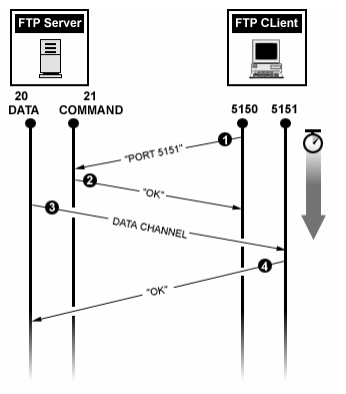 능동 모드(active mode)에서는 파일 전송 시 서버는 20번 포트를 이용한다. 능동 모드의 동작 과정은 다음 순서를 따른다.