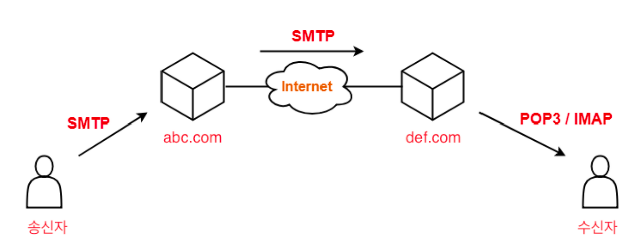 * SMTP: 메일을 송신할 때 사용하는 프로토콜로, TCP/IP 호스트 사이의 메일을 전달 할 때 사용된다.