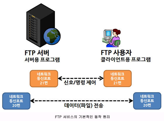 FTP는 웹 서비스와 마찬가지로 FTP 서버와 FTP 클라이언트 간에 접속을 하고, 파일을 전송하는 과정을 거친다. FTP 클라이언트는 FTP 프로그램을 통해 21번 포트를 이용하여 FTP 서버 프로그램에 접속한다. 21번 포트는 파일 전송을 제어하기 위한 신호를 주고받는다. 접속된 후에는 20번 포트를 통해 실제 파일 전송을 한다.