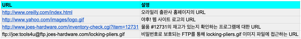 밑에 표는 어떻게 URL로 리소스의 정확한 위치와 접근방법을 표현하는지 보여준다.