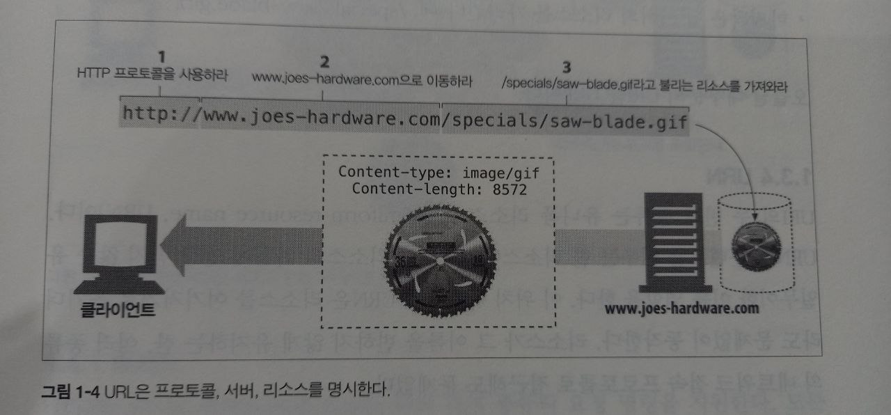 그림 1-4는 죠의 컴퓨터 가게 서버에 있는 GIF 형식의 톱날 그림 리소스에 대한 URI가 HTTP 프로토콜에서 어떻게 해석되는지 보여준다. HTTP는 주어진 URI로 객체를 찾아온다. URI에는 두 가지가 있는데, URL과 URN이라는 것이다. 이 두 종류의 자원 식별자에 대해 지금 살펴보자.