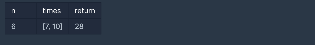 입국심사를 기다리는 사람 수 n, 각 심사관이 한 명을 심사하는데 걸리는 시간이 담긴 배열 times가 매개변수로 주어질 때, 모든 사람이 심사를 받는데 걸리는 시간의 최솟값을 return 하도록 solution 함수를 작성해주세요.