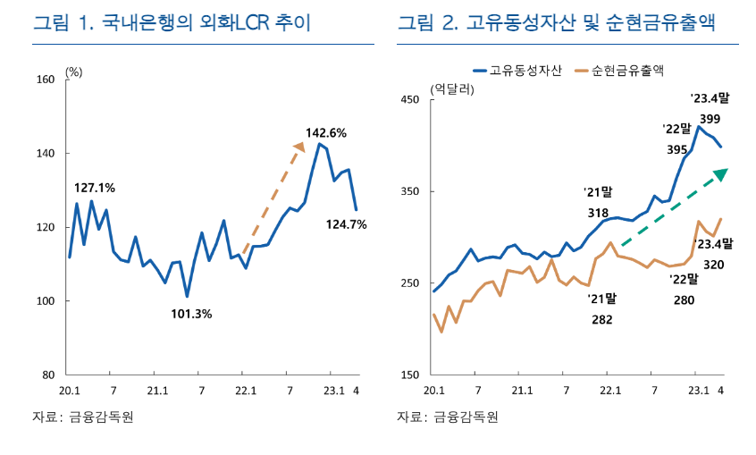 한국은행 블로그에서는 2022년 중 외화 LCR의 상승은 고유동자산 보유 확대(분자 요인) 으로 급격하게 상승하였다고 하며, 2023년 중 하락은 순현금유출액 증가(분모 요인)이라고 보고 있다.