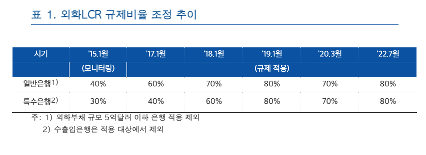 실제로 외화 LCR은 2015년부터 모니터링 지표로 활용되다가 2017년부터 정식 도입되었다.