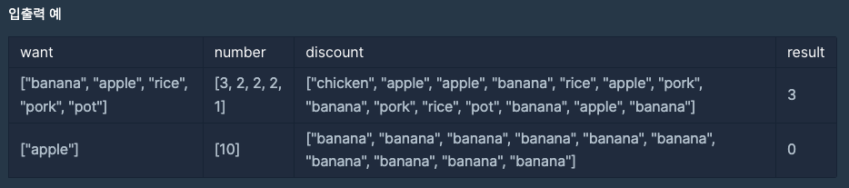 정현이가 원하는 제품을 나타내는 문자열 배열 want와 정현이가 원하는 제품의 수량을 나타내는 정수 배열 number, XYZ 마트에서 할인하는 제품을 나타내는 문자열 배열 discount 가 주어졌을 때, 회원등록시 정현이가 원하는 제품을 모두 할인 받을 수 있는 회원등록 날짜의 총 일수를 return 하는 solution 함수를 완성하시오. 가능한 날이 없으면 0을 return 합니다.