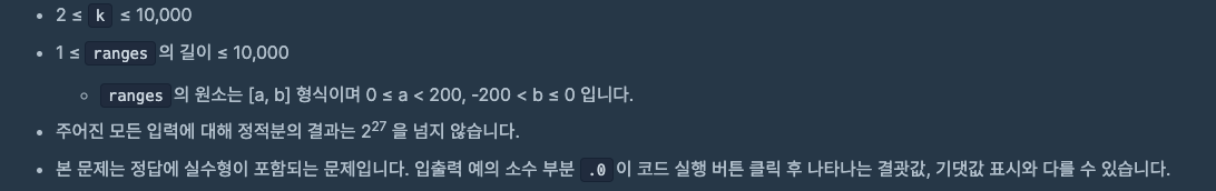 우박수의 초항 k와, 정적분을 구하는 구간들의 목록 ranges가 주어졌을 때 정적분의 결과 목록을 return 하도록 solution을 완성해주세요. 단, 주어진 구간의 시작점이 끝점보다 커서 유효하지 않은 구간이 주어질 수 있으며 이때의 정적분 결과는 -1로 정의합니다.