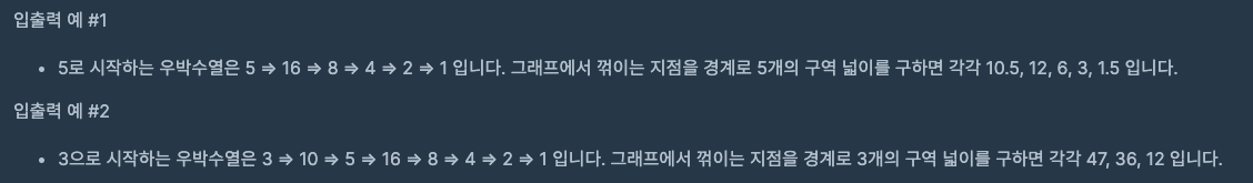 문제 [우박수열 정적분]의 문제는 간단하게 정리하자면, 콜라츠 추측을 사용하여서 우박 수열을 구하고, 수열의 값을 기준으로 그래프의 범위를 알게됨으로써 주어진 값들을 기준으로 정적분의 값을 계산하는 문제였다.