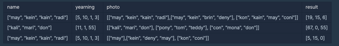 사진들을 보며 추억에 젖어 있던 루는 사진별로 추억 점수를 매길려고 합니다. 사진 속에 나오는 인물의 그리움 점수를 모두 합산한 값이 해당사진의 추억 점수가 됩니다. 예를 들어 사진 속 인물의 이름이 ["may", "kein", "kain"]이고 각 인물의 그리움 점수가 [5점, 10점, 1점]일 때 해당 사진의 추억 점수는 16(5 + 10 + 1)점이 됩니다. 다른 사진 속 인물의 이름이 ["kali", "mari", "don", "tony"]이고 ["kali", "mari", "don"]의 그리움 점수가 각각 [11점, 1점, 55점]이고, "tony"는 그리움 점수가 없을 때, 이 사진의 추억 점수는 3명의 그리움 점수를 합한 67(11 + 1 + 55)점입니다.