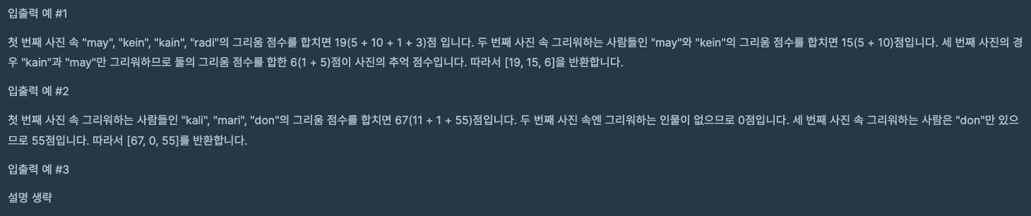 [ 추억 점수 ] 문제는 점수를 줄 수 있는 이름들의 합을 구하는 문제이다.