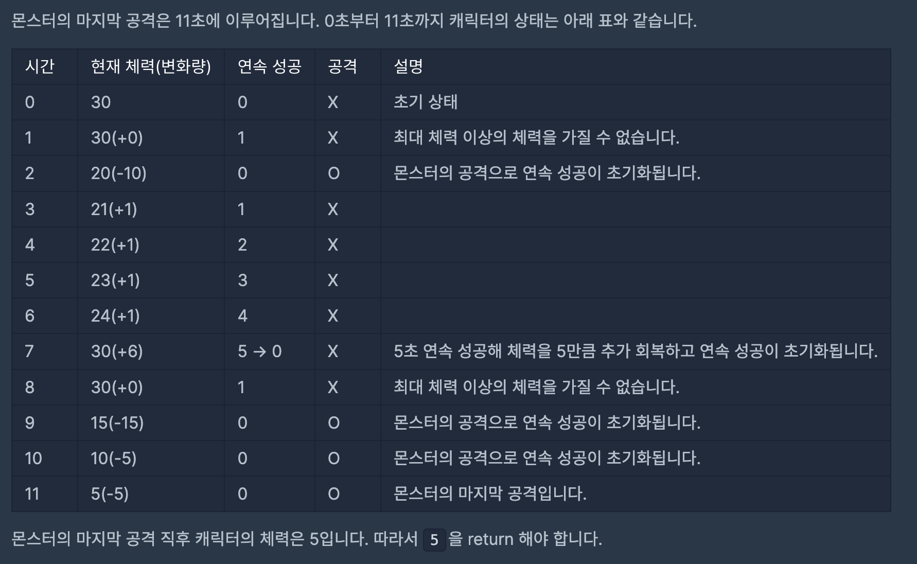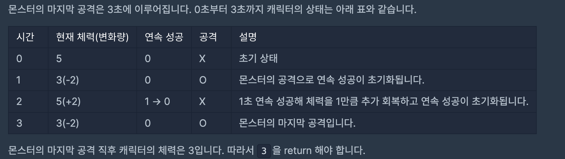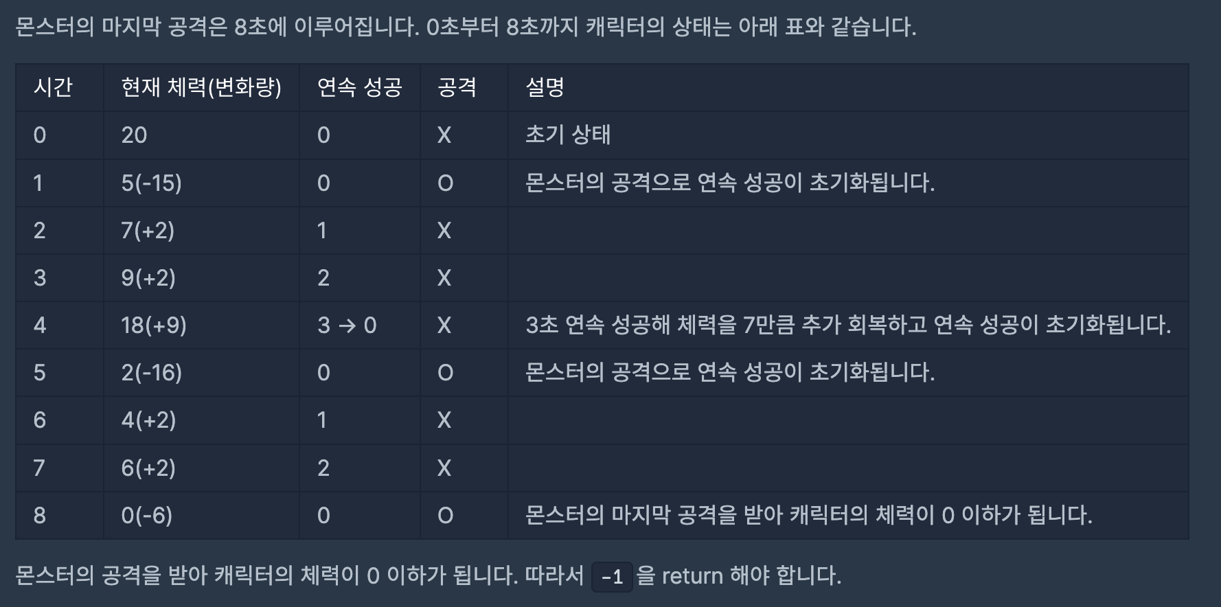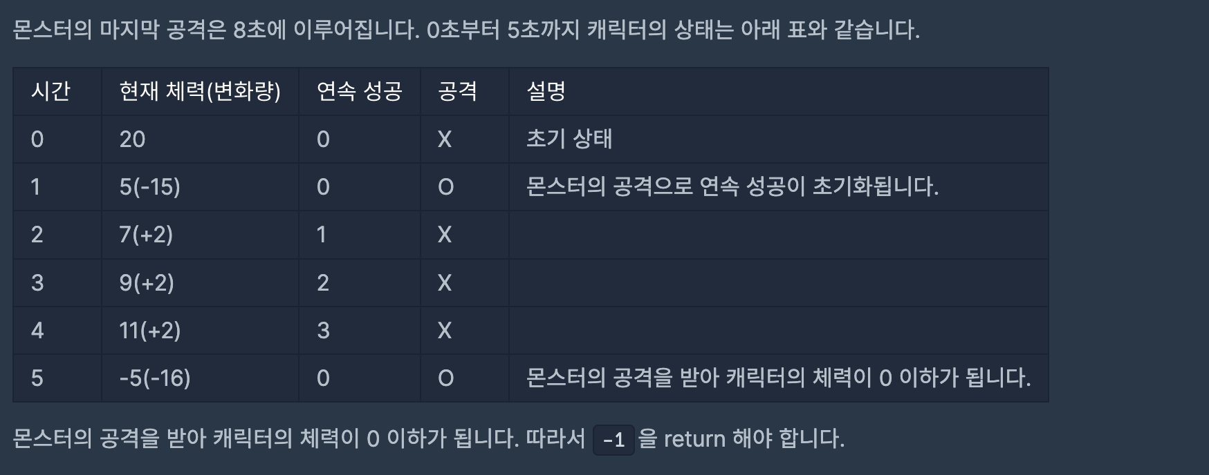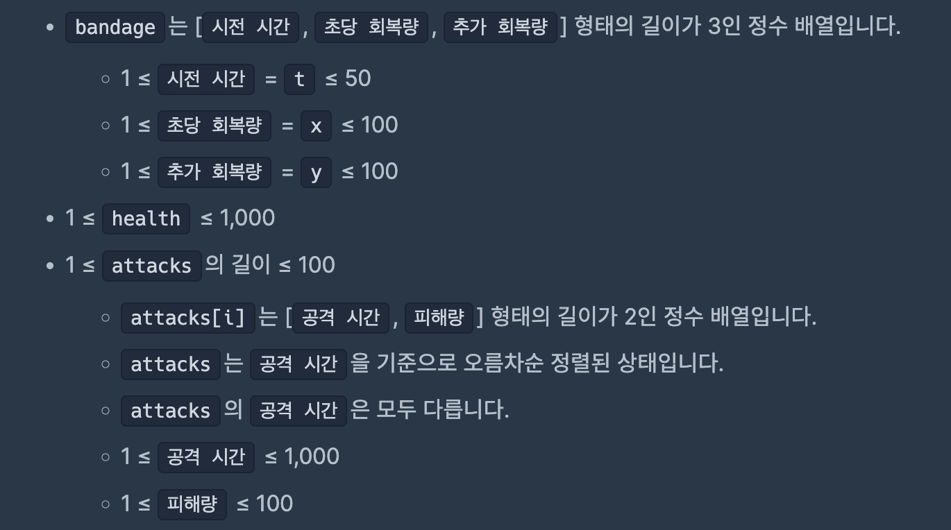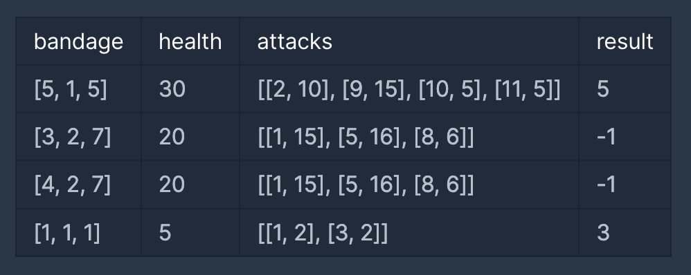 붕대 감기 기술의 시전 시간, 1초당 회복량, 초가 회복량을 담은 1차원 정수 배열 bandage와 최대 체력을 의미하는 정수 health, 몬스터의 공격 시간과 피해량을 담은 2차원 정수 배열 attacks가 매개변수로 주어집니다. 모든 공격이 끝난 직후 남은 체력을 return 하도록 solution 함수를 완성해주세요. 만약 몬스터의 공격을 받고 캐릭터의 체력이 0 이하가 되어 죽는다면 -1을 return 해주세요.