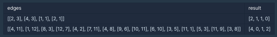 그래프의 간선 정보를 담은 2차원 정수 배열 edges가 매개변수로 주어집니다. 이때, 생성한 정점의 번호, 도넛 모양 그래프의 수, 막대 모양 그래프의 수, 8자 모양 그래프의 수를 순서대로 1차원 정수 배열에 담아 return 하도록 solution 함수를 완성해 주세요.