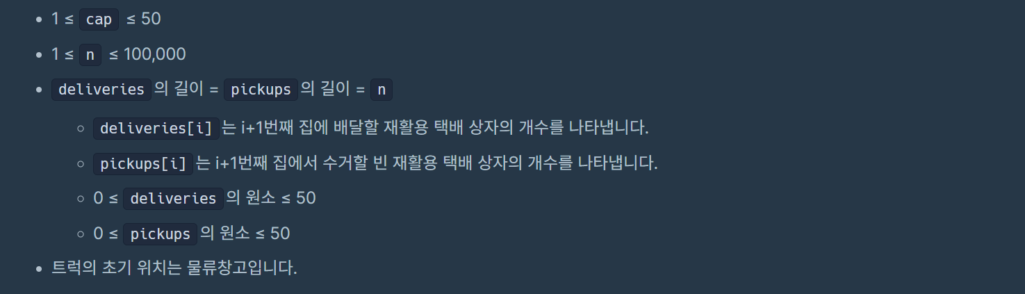 트럭에는 재활용 택배 상자를 최대 cap개를 실을 수 있습니다. 트럭은 배달할 재활용 택배 상자들을 실어 물류창고에서 출발해 각 집에 배달하면서, 빈 재활용 택배 상자들을 수거해 물류창고에 내립니다. 각 집마다 배달할 재활용 택배 상자의 개수와 수거할 빈 재활용 택배 상자의 개수를 알고 있을 때, 트럭 하나로 모든 배달과 수거를 마치고 물류창고까지 돌아올 수 있는 최소 이동 거리를 구하려 합니다. 각 집에 배달 및 수거할 때, 원하는 개수만큼 택배를 배달 및 수거할 수 있습니다.