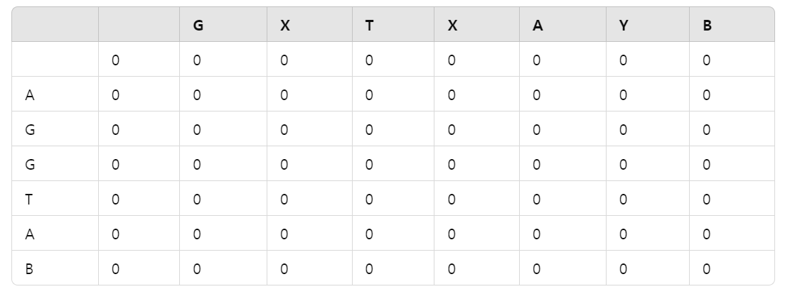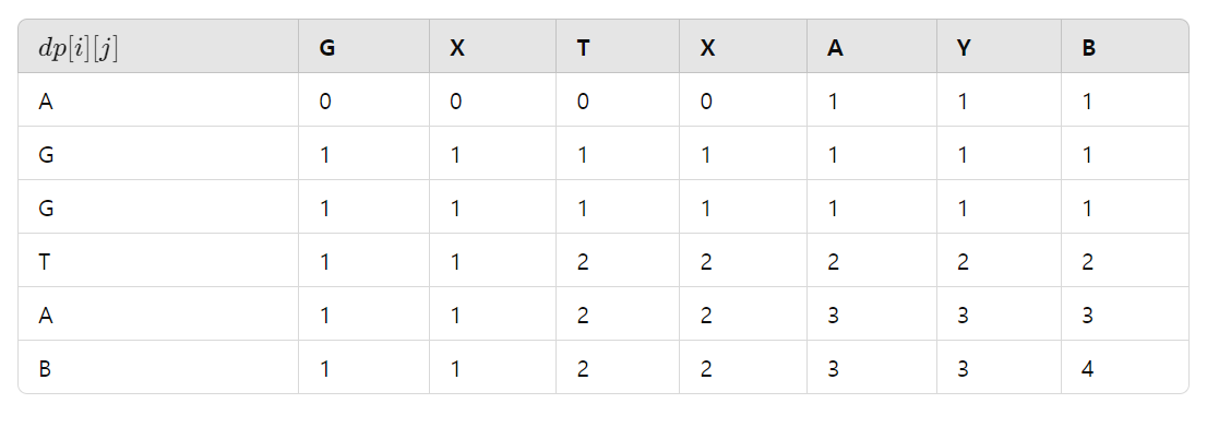 i = "AGGTAB" 이므로 A, G, G ... B 를 출력, J = "GXTXAYB" 이므로 G, X, T ... B 까지 출력한다.