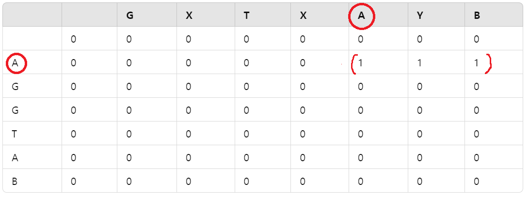 if X[i - 1] == Y[j - 1]: # 문자가 일치하면