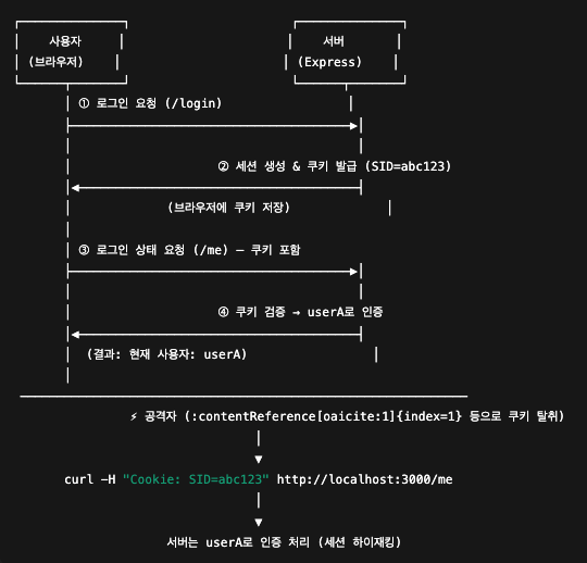 핵심: 세션 쿠키(=Session ID, SID) 만 확보되면 비밀번호 없이 로그인 상태 재현이 가능하다.