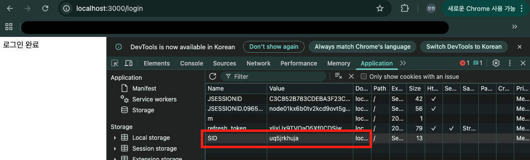 2) SID 를 Application에서 쿠키 확인 할 수 있다.