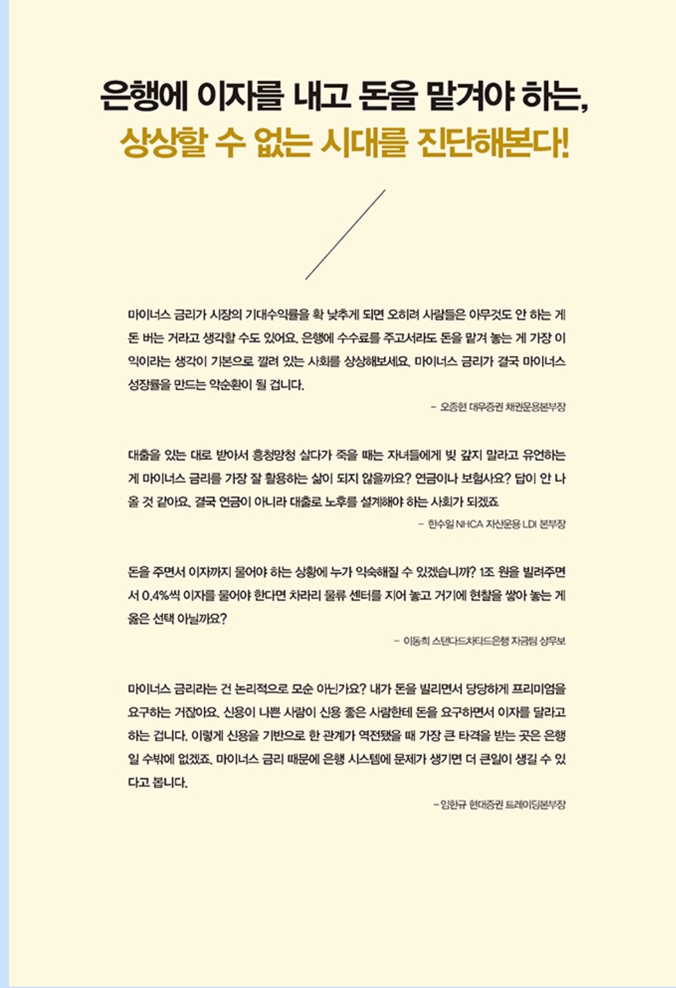 이 책 마이너스 금리시대의 저자들은 자신들의 마이너스 금리시대가 도래했을 때의 모습과 가상의 인터뷰로 조금 더 이해를 쉽게 만들려는 노력을 보았다.