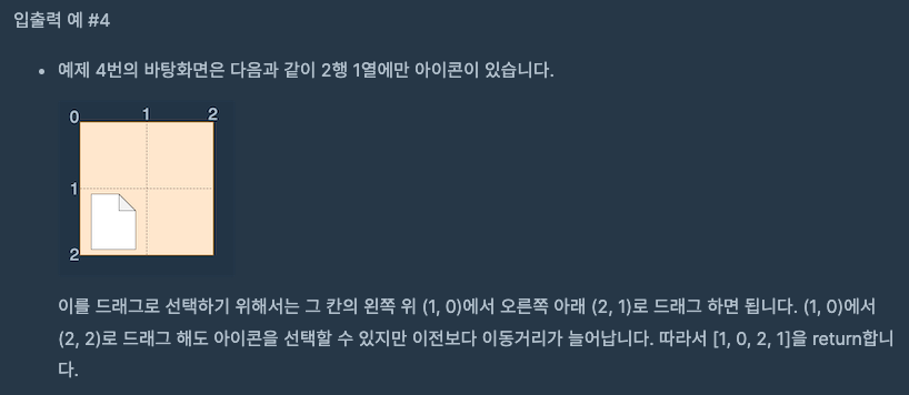 이러한 바탕화면에서 다음 그림과 같이 S(0, 1)에서 E(3, 4)로 드래그하면 세 개의 파일이 모두 선택되므로 드래그 한 거리 (3 - 0) + (4 - 1) = 6을 최솟값으로 모든 파일을 선택 가능합니다.